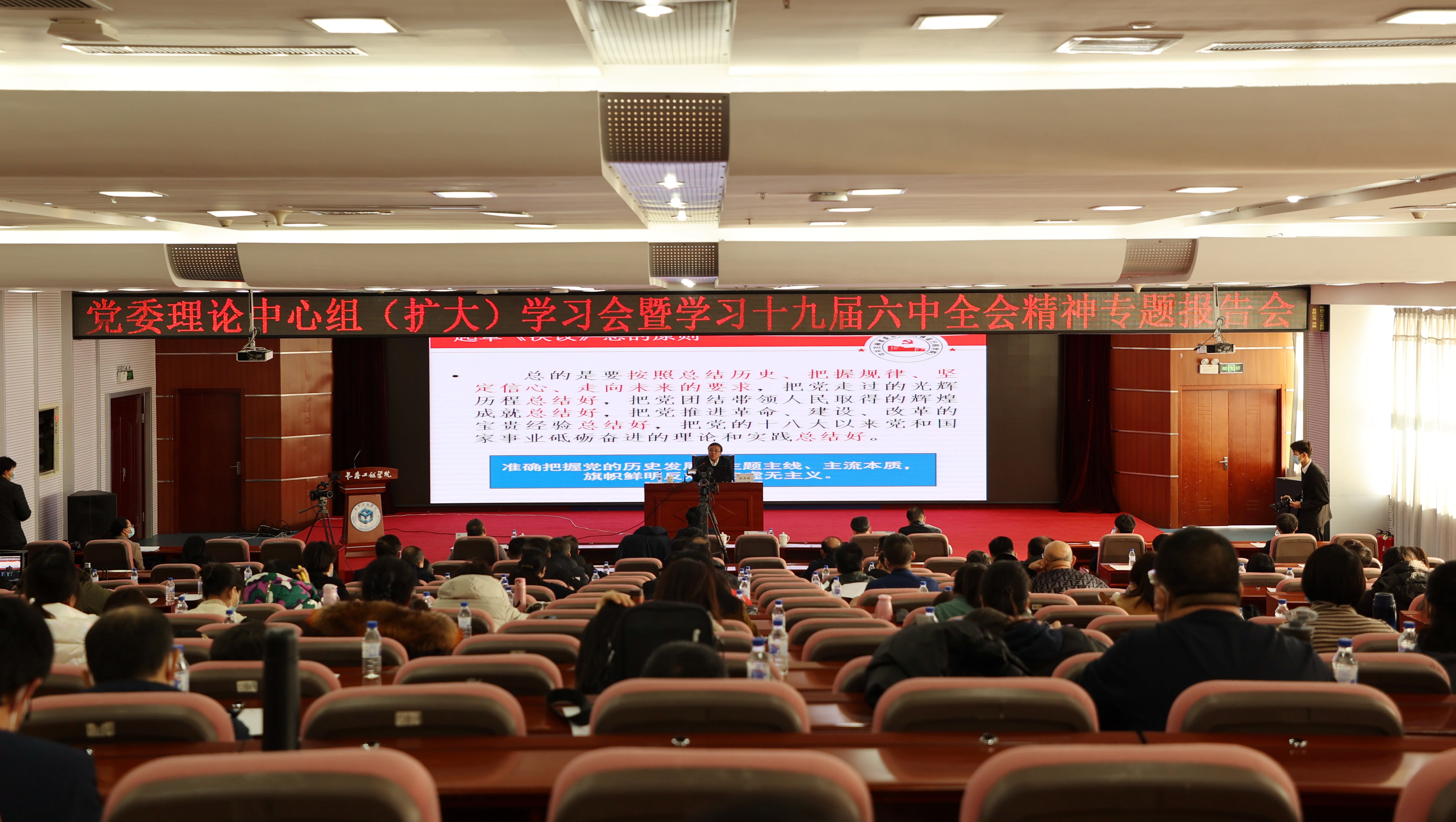 为深入学习贯彻党的十九届六中全会精神,11月24日,九游j9官网入口(中国)官方网站召开了党委理论学习中心组(扩大)学习会暨学习十九届六中全会精神专题报告会。九游j9官网入口(中国)官方网站邀请省委党校中共党史教研部主任耿洪彬教授做了题为《全面把握党的百年奋斗重大成就和历史经验---学习领会党的十九届六中全会精神》的专题报告。报告会在九游j9官网入口(中国)官方网站第三报告厅举行,九游j9官网入口(中国)官方网站领导陈权、刘兆国、杨永生、王延博参加了报告会。会议由陈权校长主持。