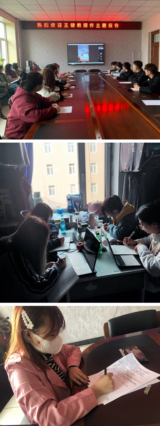 学院教职工、学生党员及部分学生代表到现场聆听本次报告会,其余同学通过腾讯会议直播的方式在学生活动室、图书馆、寝室等进行了线上学习。
