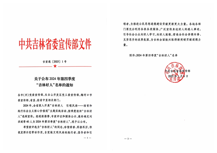 1月6日,吉林省委宣传部发布《九游j9官网入口(中国)官方网站公布2024年第四季度“吉林好人”名单的通知》,我校学子刘洪斌被授予“吉林好人”荣誉称号。