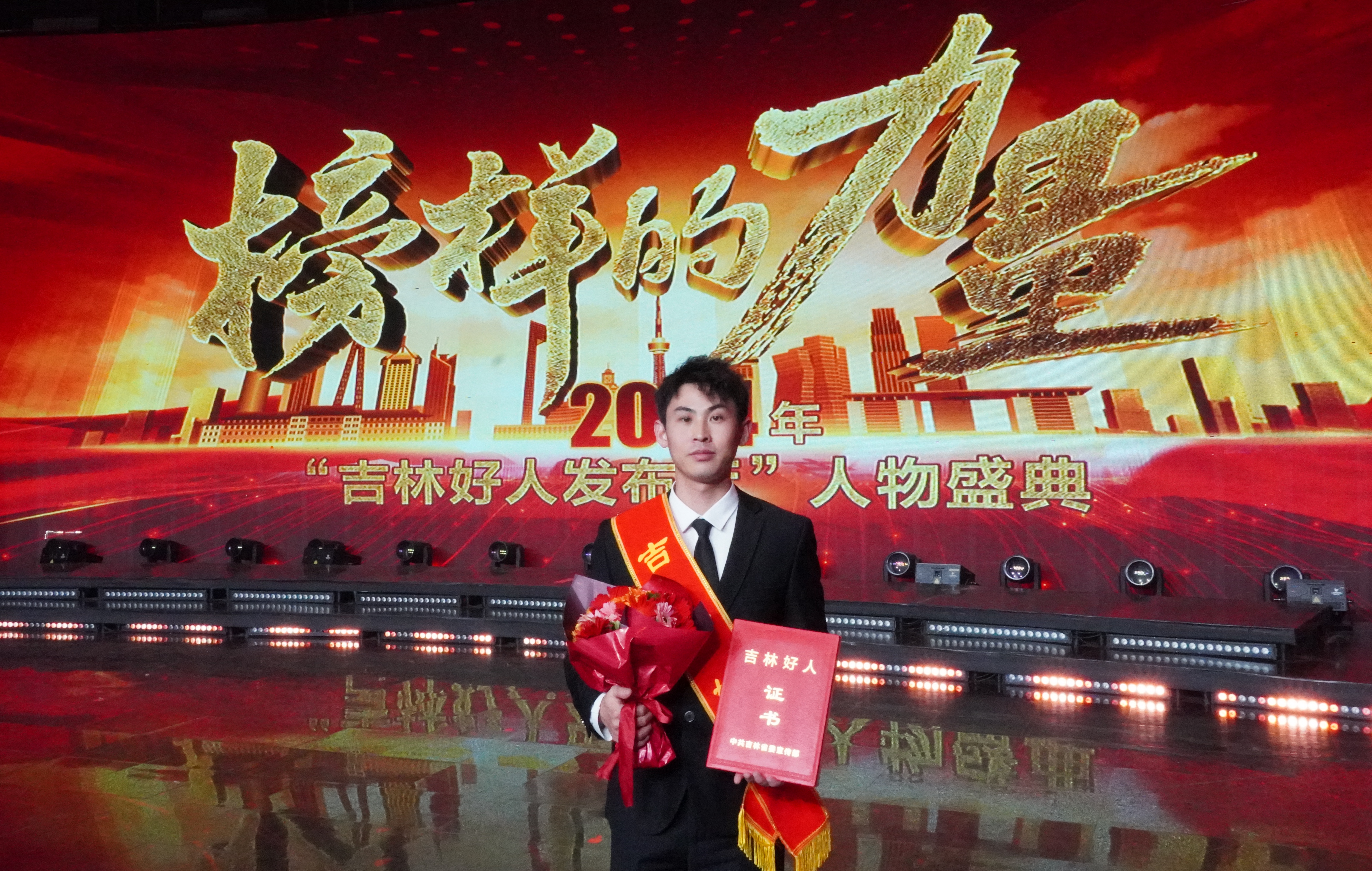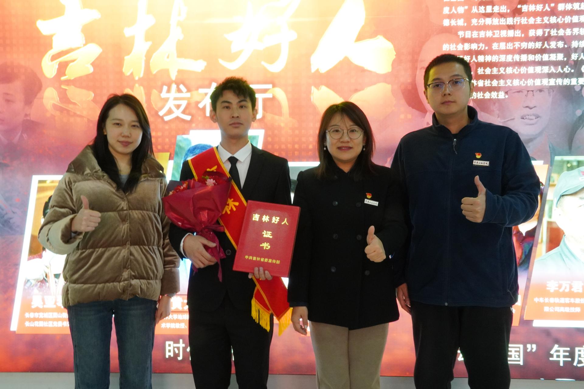 1月8日,由省委宣传部主办、吉林广播电视台承办的《榜样的力量——2024年“吉林好人发布厅”人物盛典》活动举行,省委副书记吴海英,省委常委、宣传部部长曹路宝出席活动。刘洪斌同学应邀参加活动并接受颁奖。