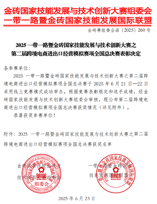 一带一路暨金砖国家技能发展与技术创新大赛由金砖国家工商理事会中方理事会、一带一路暨金砖国家技能发展国际联盟、一带一路暨金砖国家技能发展与技术创新培训中心、中国发明协会、教育部中外人文交流中心等主办,金砖国家工商理事会技能发展、应用技术与创新中方工作组承办。跨境电商进出口经营模拟赛项经过校赛、省赛、国赛,历时三个月,团队成员在指导教师的带领下刻苦钻研专业知识,持续优化竞赛策略,最终在国赛中脱颖而出,斩获全国一等奖。