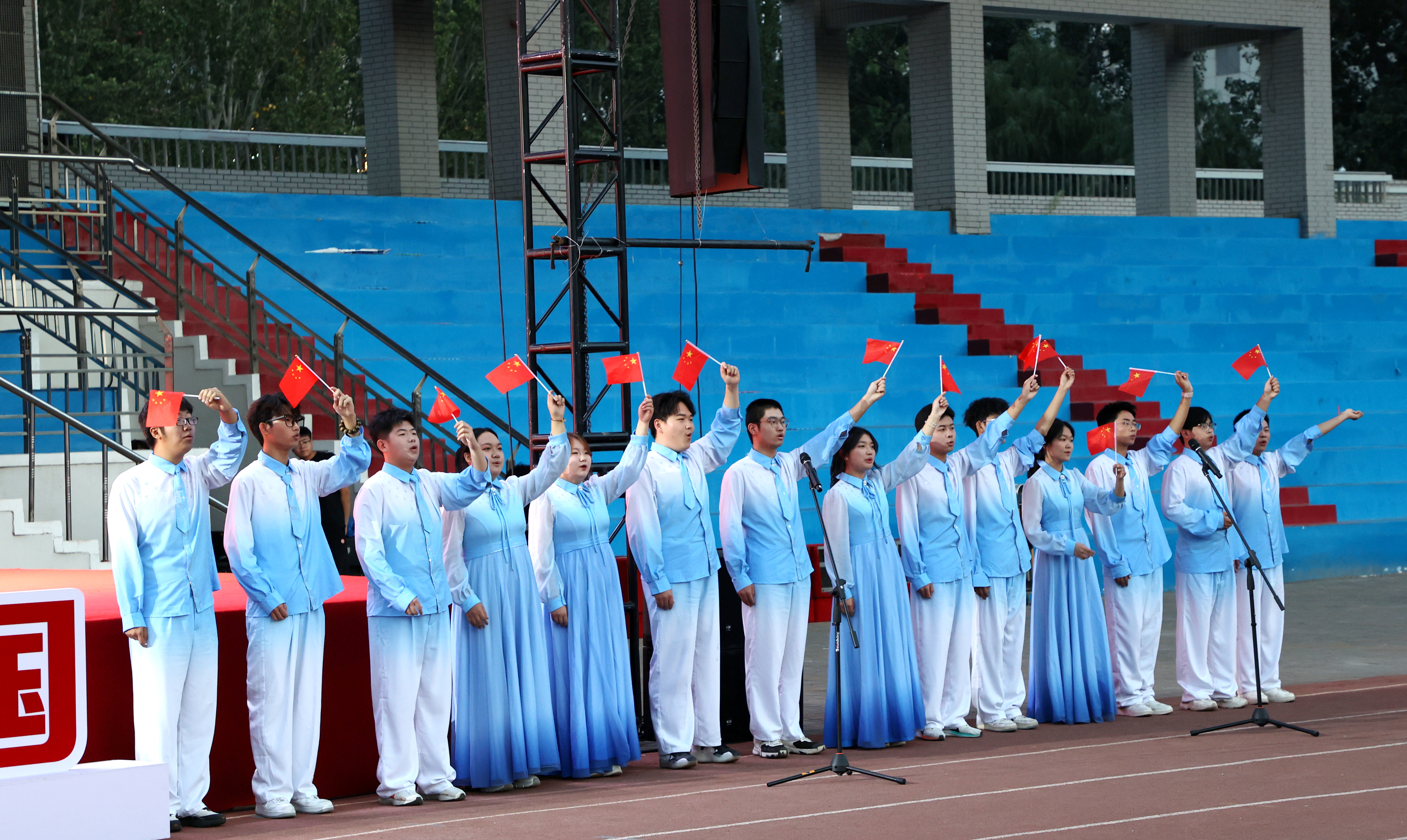 在新中国成立76周年即将到来之际,在“杨靖宇支队”战旗荣归故里之时,9月29日,九游j9官网入口(中国)官方网站2025级新生开学第一堂思政大课在湖西校区体育场举行。