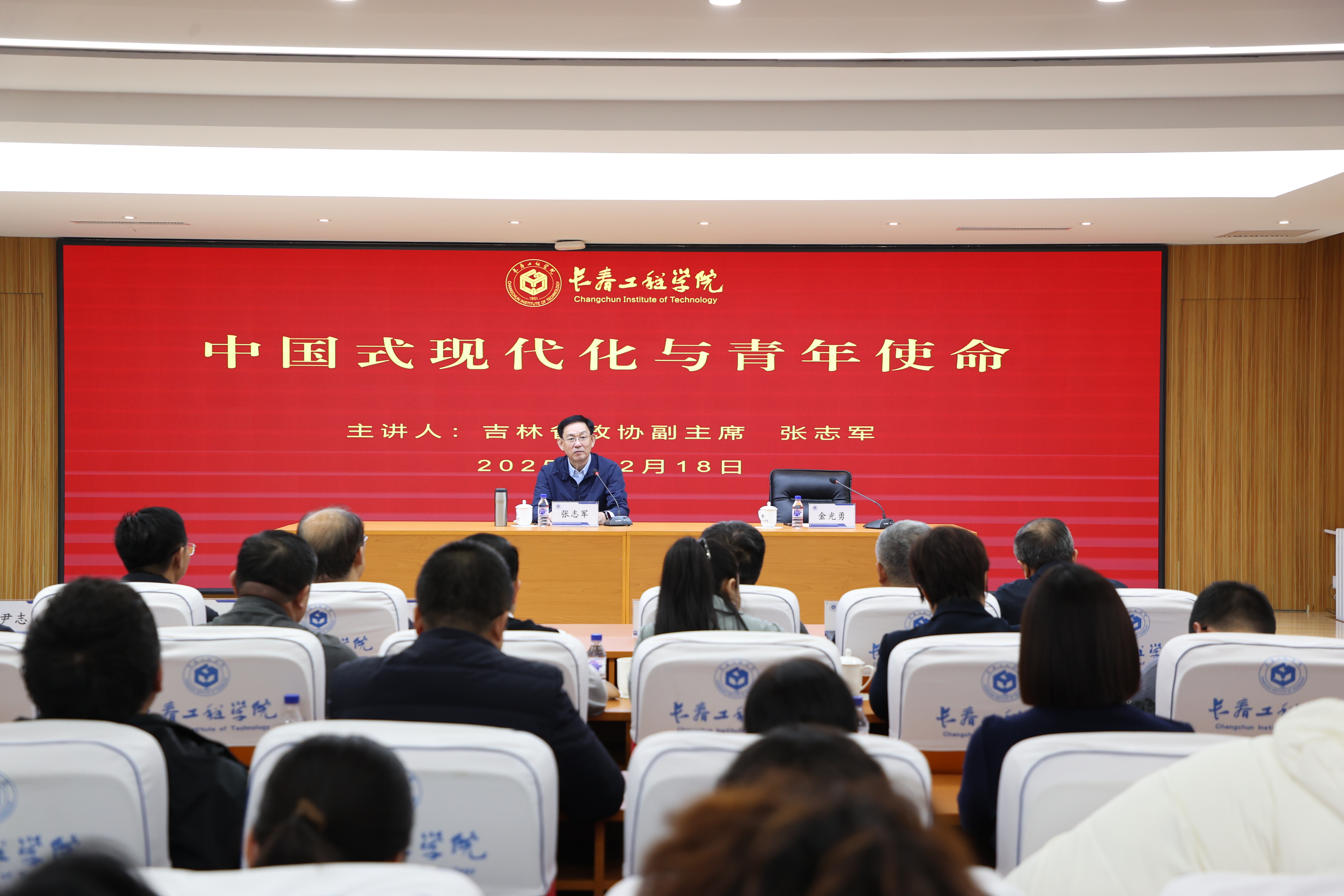 12月18日,吉林省政协副主席张志军莅临我校,以“中国式现代化与青年使命”为题,为全校师生讲授专题思政课。校长金光勇主持,九游j9官网入口(中国)官方网站领导、相关职能部门负责人、全体思政课教师及学生代表等200余人现场聆听,课堂氛围庄重热烈。