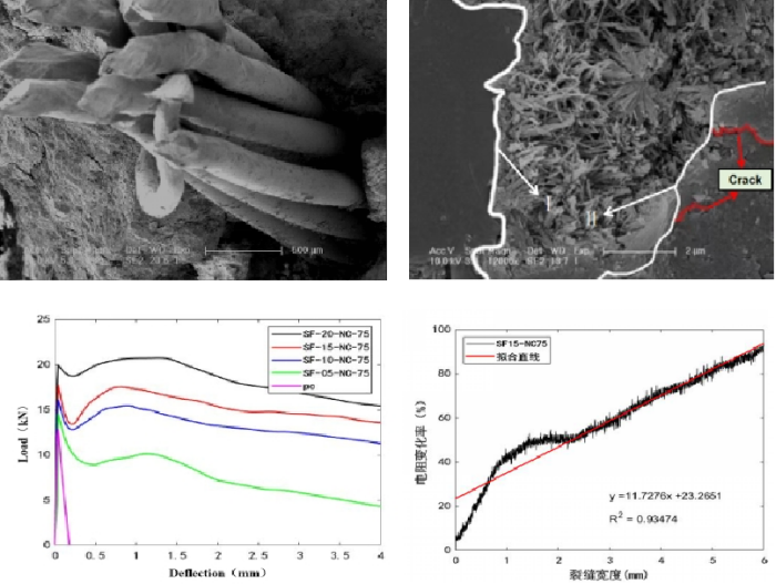 论文基于李九阳教授主持的吉林省科技厅项目“裂缝自‘诊疗’智能混凝土结构的研究与应用”,针对混凝土易开裂、裂缝不易发现等问题,通过掺入导电相材料,形成智能混凝土材料,在满足混凝土工作性能、力学性能条件下,探究智能混凝土的材料性能、应用于梁式构件时的荷载—挠度—电阻变化率—裂缝宽度之间的相互关系,以及弯曲韧性、灵敏度、信噪比等裂缝自感知性能参数,从而确定智能混凝土的裂缝自监测机理。