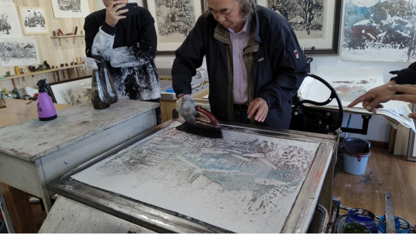 图3 朱晓东教授现场为科创团队演示冰版画拓印过程