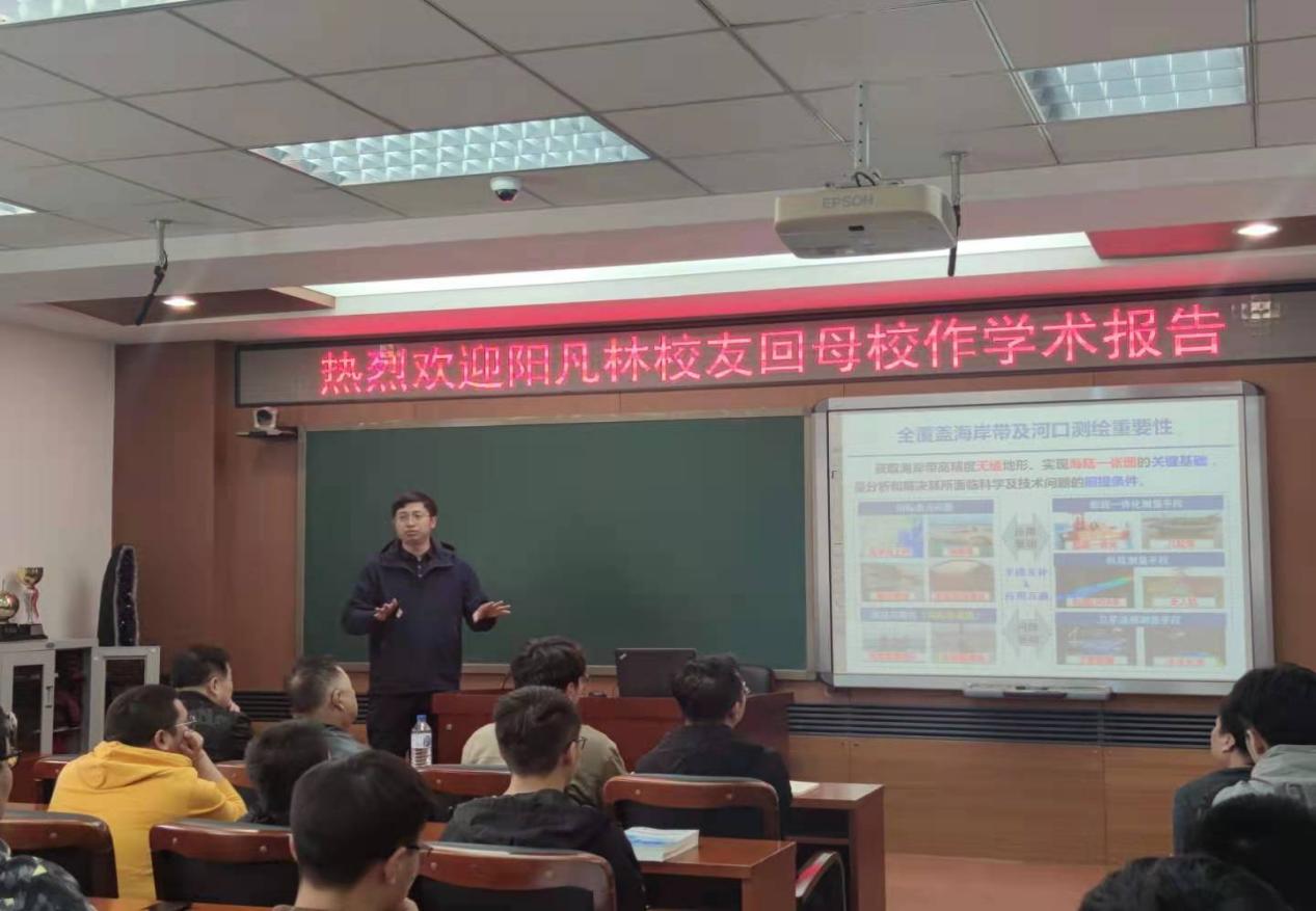 会上,阳凡林校友对多波束海底底质分类方法、多源数据协同海岸线反演算法、GNSS水下定位方法、海岸带测绘的有关理论技术作了详细讲解,并对海岸带测量的重要意义进行了深入解读。此外,他还介绍了其科研团队的优秀成果。报告结束后,阳凡林校友回答了同学们提出的问题,并与大家交流心得体会,与会师生表示获益匪浅。