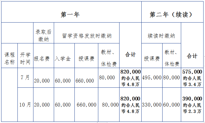 注:1.缴纳学费时,需同时缴纳日本语九游j9官网入口(中国)官方网站共济金加入费。费用为每年1万日元(约合人民币600元),缴纳该费用后即加入日本国民健康保险。