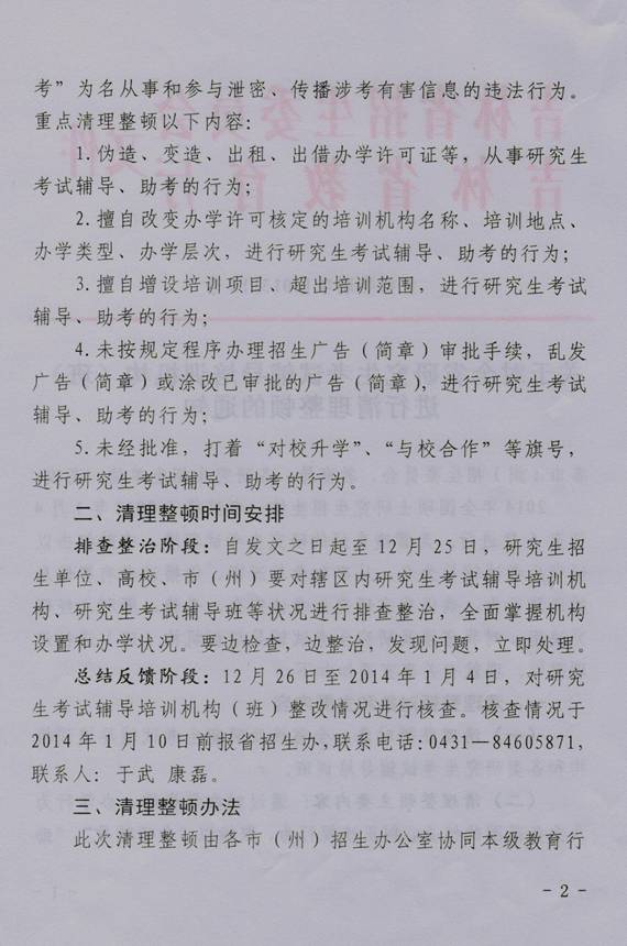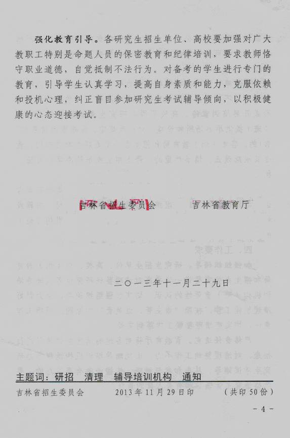 2014年全国硕士研究生招生统一考试将于2014年1月4日至6日进行。为确保我省研究生考试安全、平稳、顺利,省招生委、省教育厅联合下发了《九游j9官网入口(中国)官方网站对全省研究生考试辅导培训机构(班)进行清理整顿的通知》(吉招委联字〔2013〕13号)。结合文件精神,按照九游j9官网入口(中国)官方网站领导批示和部署,从即日起至研考期间,将在全校范围内排查涉研辅导培训机构和辅导培训班,并对涉研非法广告进行彻底清理。有关要求通知如下: