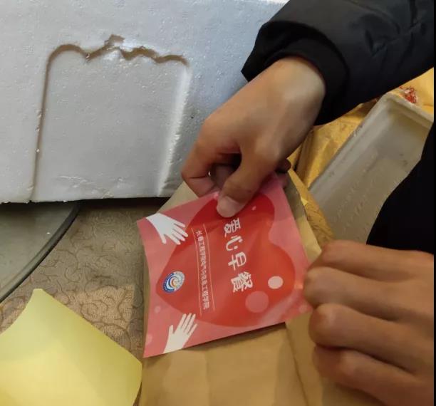 一杯豆浆、一碗小米粥、一只茶叶蛋、三个包子、一袋小咸菜,早餐很丰盛,每一份都统一包装,还配备了统一的包装袋、餐具。喝豆浆的吸管、吃包子的筷子,豆浆、粥的摆放,包口怎么折、爱心贴怎么贴…… 这些细节都有统一的要求,所有工作做完,天才蒙蒙亮。