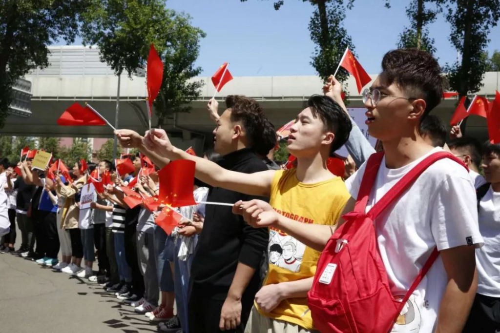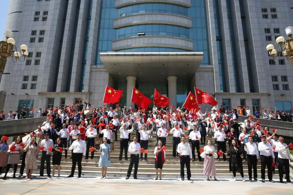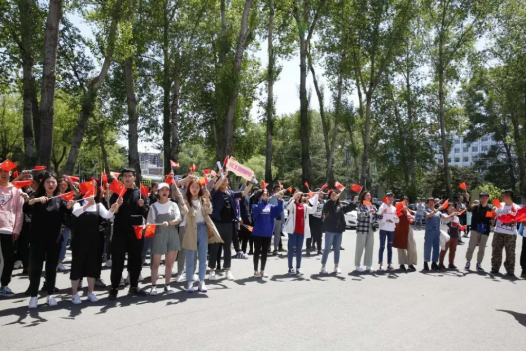 悠扬的歌声回荡在校园里,手中的红旗闪动,形成了一道靓丽的风景线。