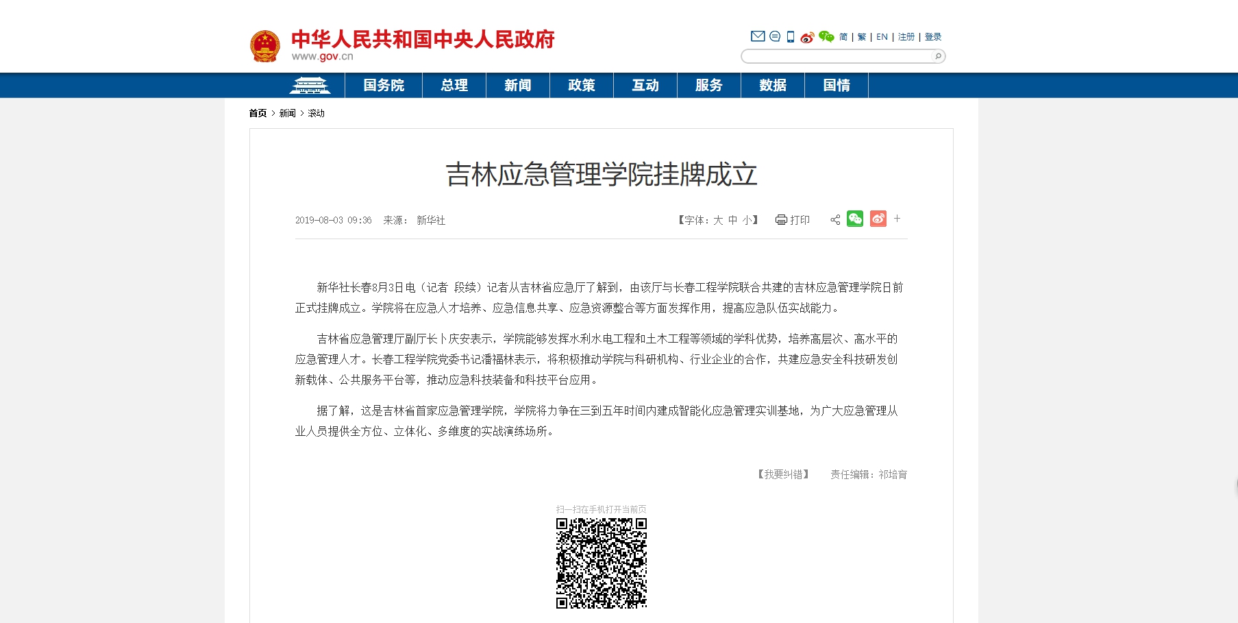 【中央人民政府网】吉林应急管理学院挂牌成立