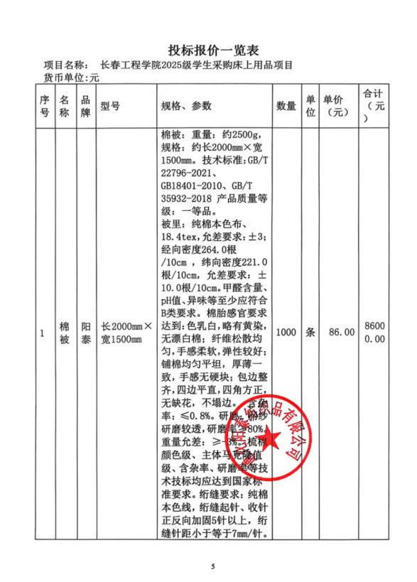 [中标结果公告]九游j9官网入口(中国)官方网站2025级学生采购床上用品项目
